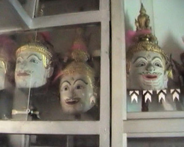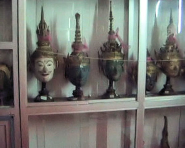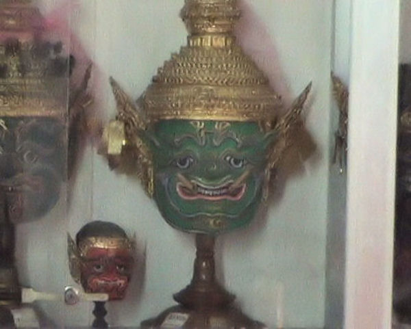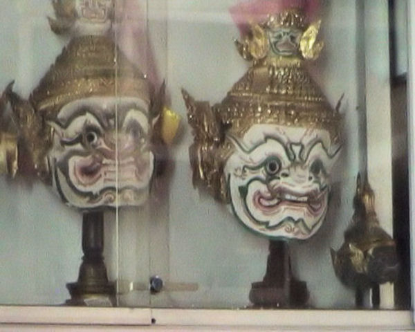 Masken im Wat Phra Phiren. Dieses Gebäude ist normalerweise für Besucher geschlossen. Nach einem langen Gespräch mit einem Mönch des Wat, zeigte dieser mir die Schätze des Wat, die jährlich bei Sonderaufführungen des Ramakien getragen werden. |